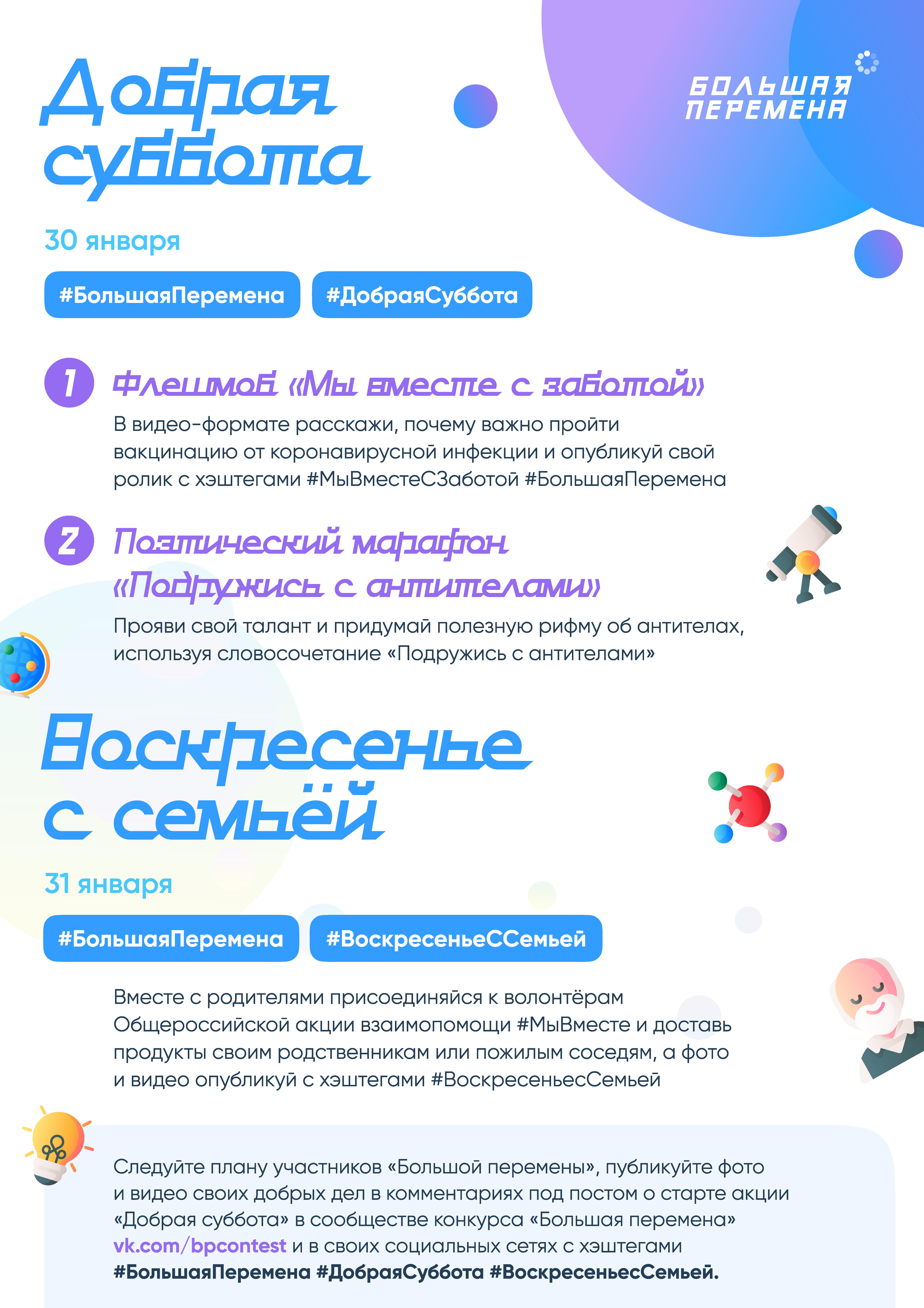 28.01.2021Участники Всероссийского конкурса для школьников «Большая перемена» – проекта президентской платформы «Россия – страна возможностей» – в рамках еженедельной акции «Добрая суббота» присоединятся к проекту Всероссийской акции взаимопомощи #МыВместе по информированию граждан о вакцинации от коронавирусной инфекции.