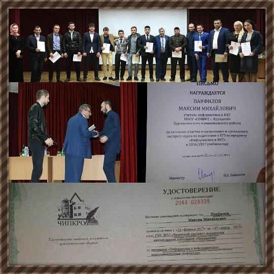 26.04.2017За активное участие в организации и проведении экспресс-курсов по подготовке к ЕГЭ по предмету "Информатика и ИКТ" в 2016-2017 учебном году наш учитель информатики – Панфилов М.М. награжден благодарственным письмом Министерства образования и науки Чеченской Республики.