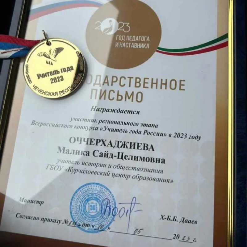 Учитель истории и обществознания ГБОУ «Курчалоевский центр образования» Оччерхаджиева Малика Сайд-Целимовна участница регионального этапа Всероссийского конкурса «Учитель года России» в 2023 году.